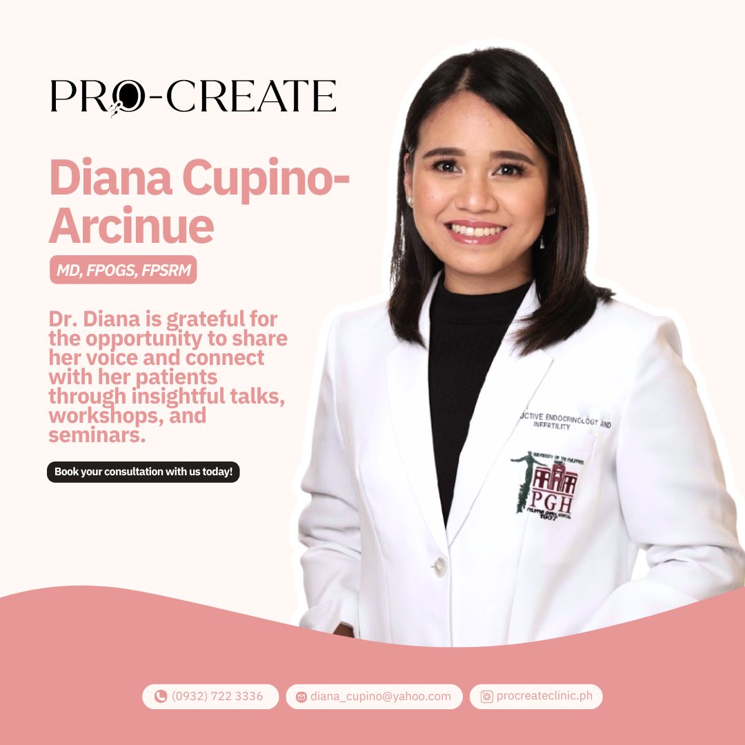 Dr. Diana Arcinue, MD, FPOGS, FPSRM, is a certified Reproductive Endocrinology and Infertility Specialist and the driving force behind Pro-Create Fertility and OB-GYN Clinic. Her commitment to women’s health began with a vision to provide quality reproductive and fertility care that is both professional and compassionate.